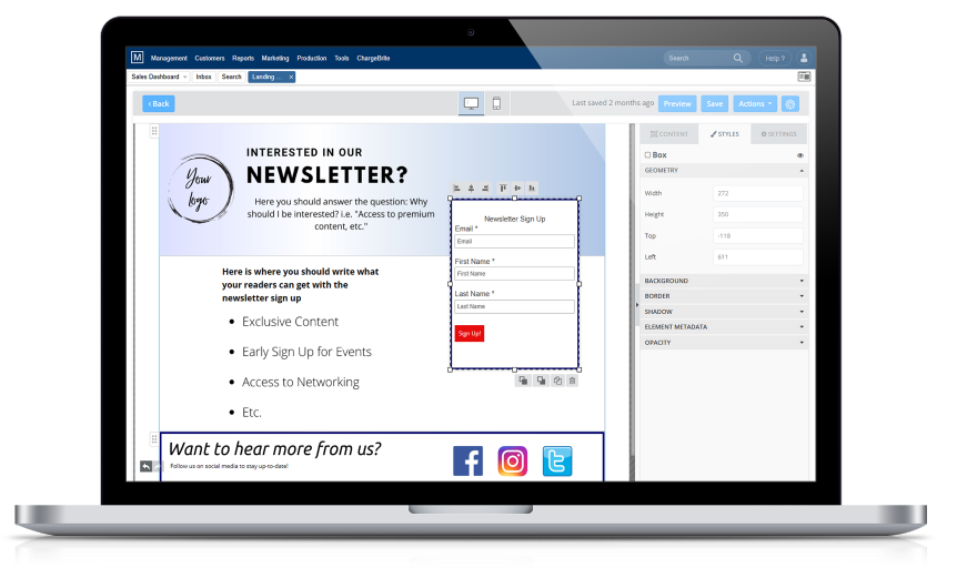 Mirabel’s Marketing Manager offers a full suite of marketing automation creation and analyzation tools, including the Landing Page Builder, Form Builder, and Workflows.